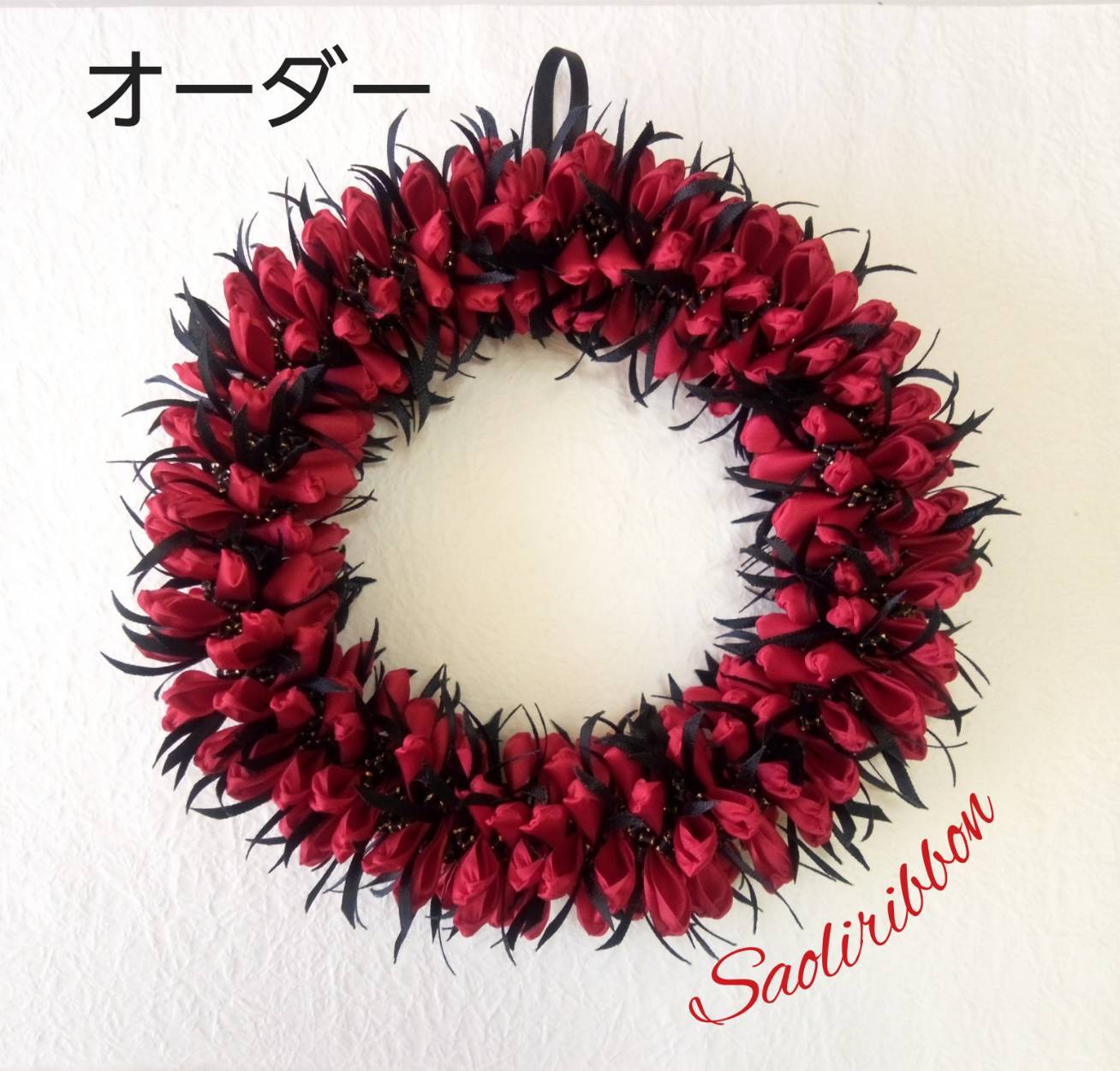 深紅の花の間から覗く、ブラックリボンのエッジに使われているゴールドがキラッと輝いて、シックな雰囲気のあるリースです。